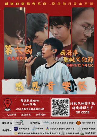 社團法人台灣西海岸發展協會誠摯邀請您,在 2025 年 11 月 22 日下午一點,一同參與這場充滿愛與旋律的年度盛會——第六屆聖誕文化節 感恩音樂祭!